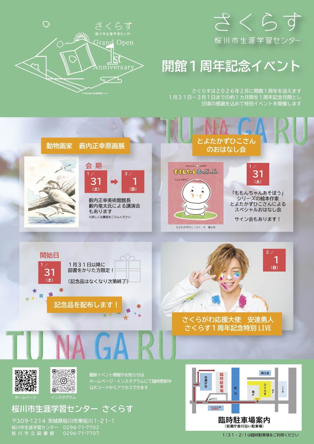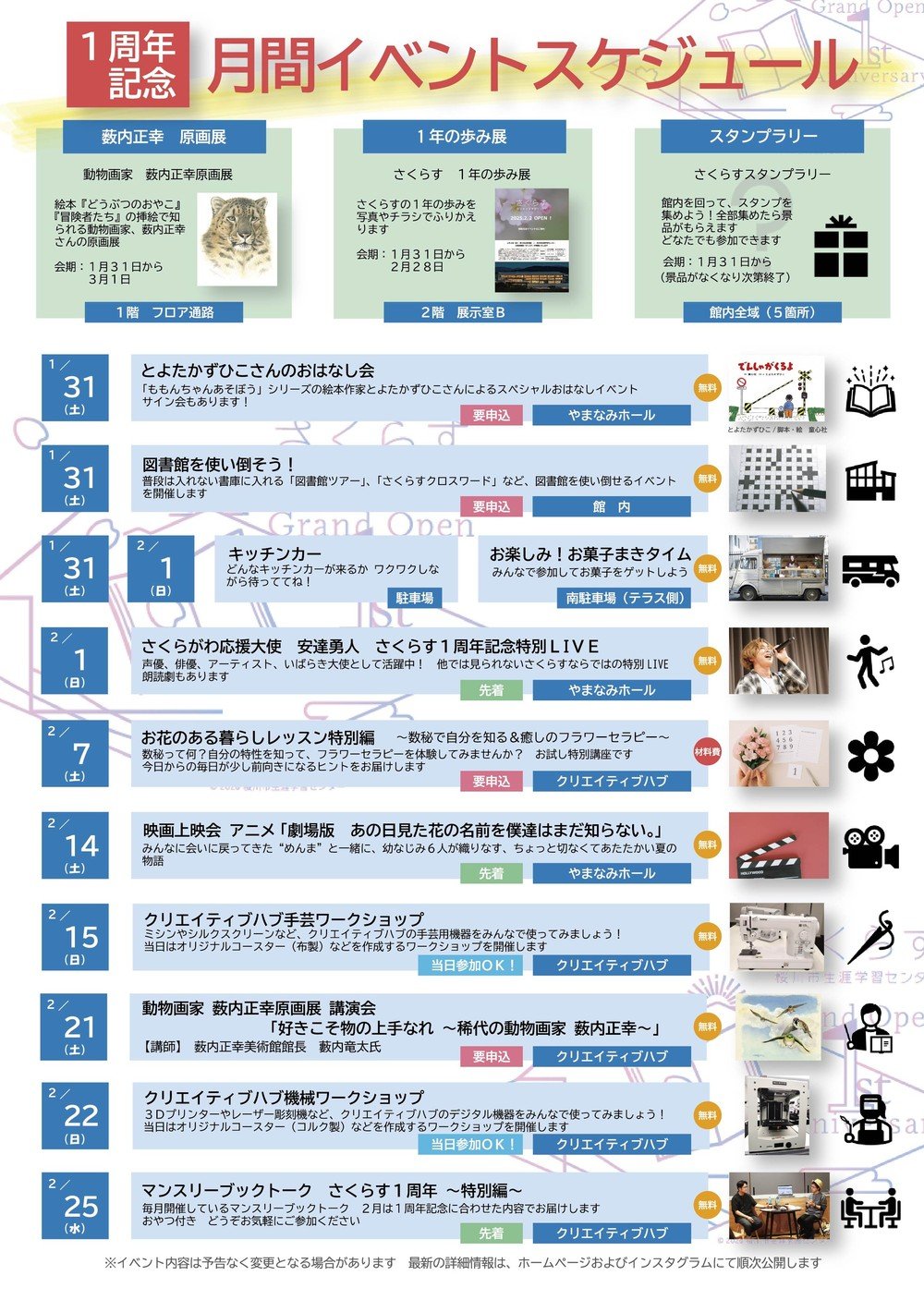 【さくらす1周年】さくらす1周年記念月間を開催します! 開催日:2026年1月31日 ~ 2026年3月 1日 さくらす 時間 09:00 ~ 20:00 内容 さくらすは2026年2月に開館から1年を迎えます。そこで1周年を記念して、2026年1月31日(土)より1カ月間、1周年記念月間を設けます。各イベントの詳細は順次お知らせしますので、カレンダーにマルをつけてお待ちください! 主催・問い合わせ 桜川市生涯学習センターさくらす TEL:0296-71-7702 次の記事