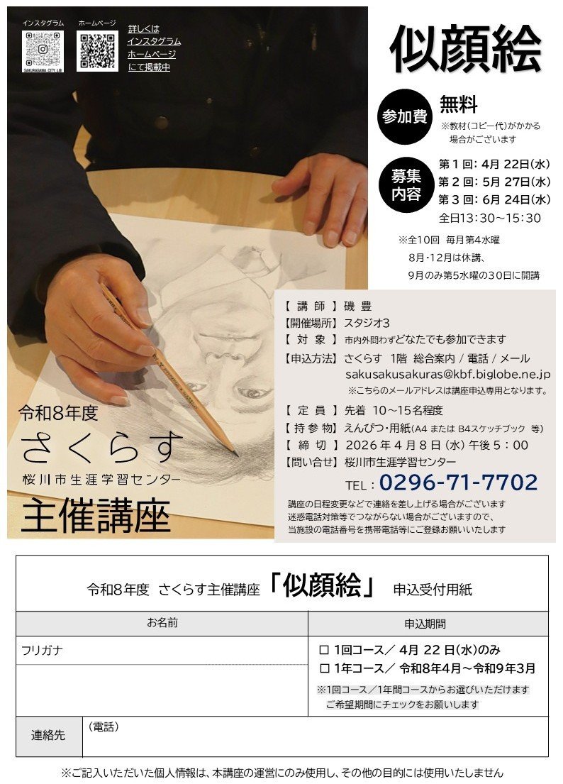 | 主催・問い合わせ | 桜川市生涯学習センターさくらす TEL:0296-71-7702 |