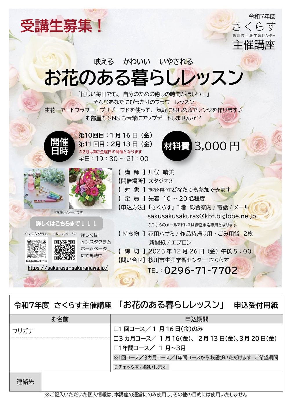 | 主催・問い合わせ | 桜川市生涯学習センターさくらす TEL:0296-71-7702 |