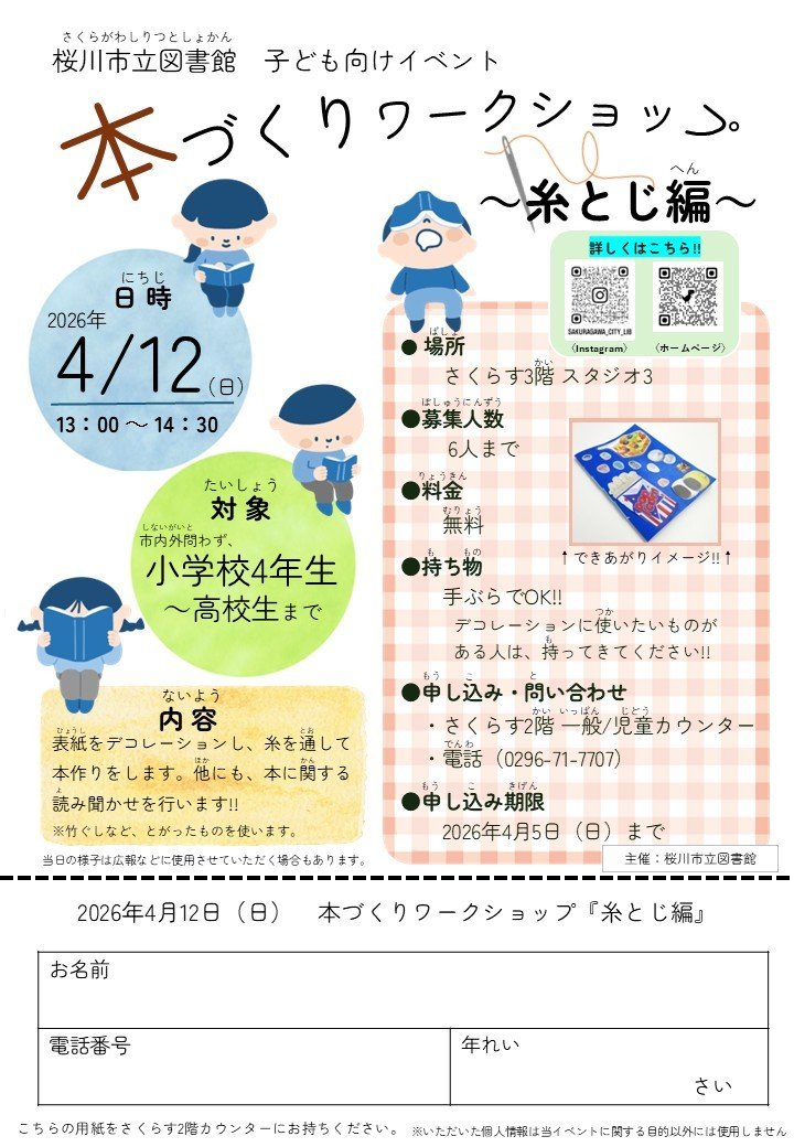 | お申込み | ・さくらす 2階 一般カウンター/児童カウンター ・電話(0296-71-7707) |