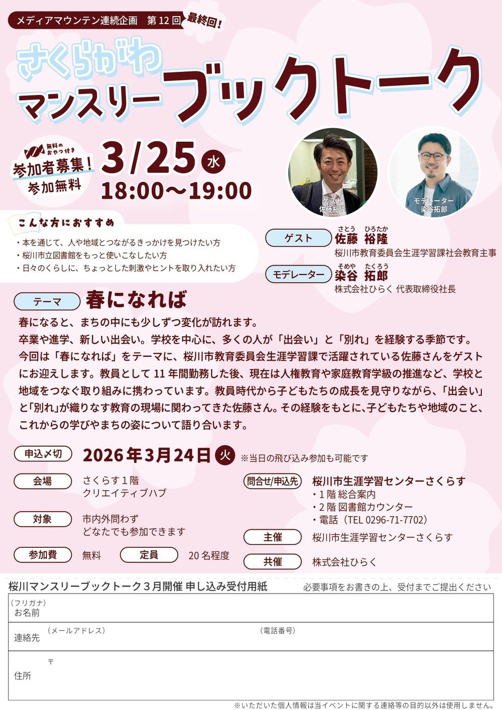 | 内容 | 3月25日 第12回 さくらがわマンスリーブックトークを開催いたします 今回のテーマは「春になれば」です。 当日の飛び入り参加も大歓迎です。みなさんぜひご参加ください!