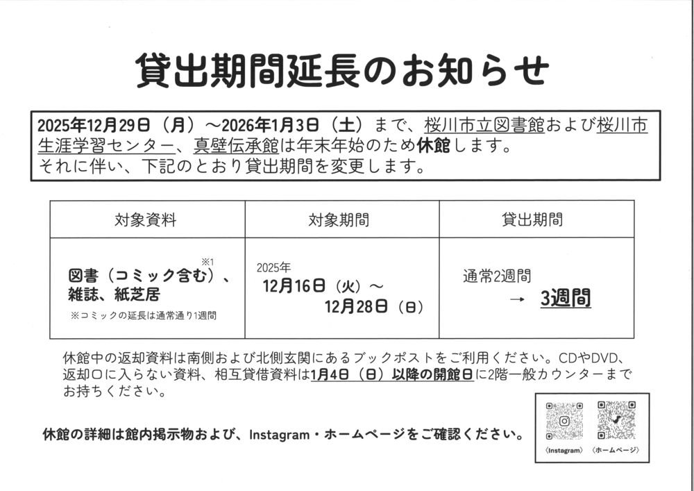 それに合わせて、年末の12月16日から28日の間、図書・紙芝居・雑誌を対象に、貸出期間が3週間となります。